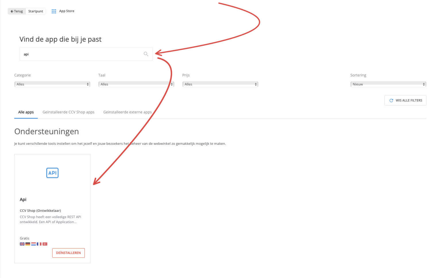 Installeer de app CCV Shop API als deze nog niet geïnstalleerd is.