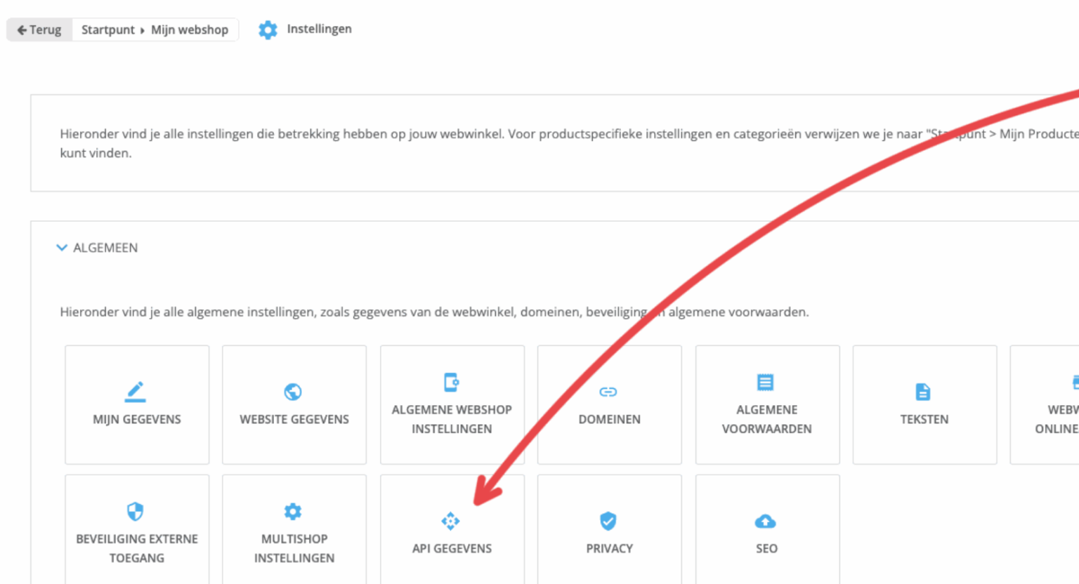 Klik daarna op My Webshop → Settings → API Data.