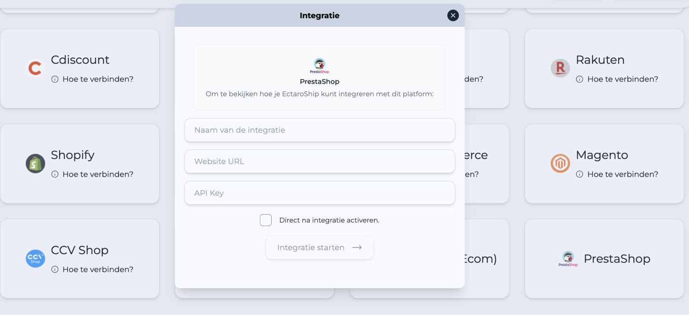PrestaShop als integratie uit de lijst.