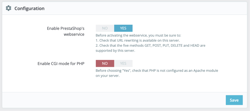 - Zet Enable PrestaShop’s Webservice op Yes en klik daarna op Save.